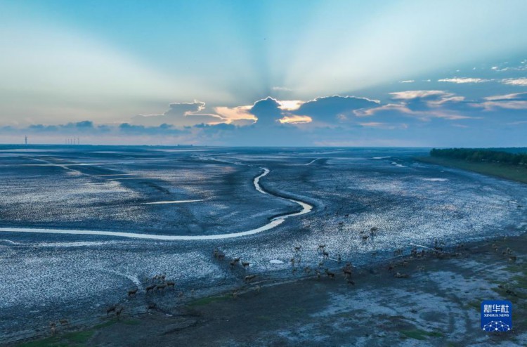 这是位于江苏盐城的大丰麋鹿国家级自然保护区晨景(2023年8月21日摄,无人机照片)。