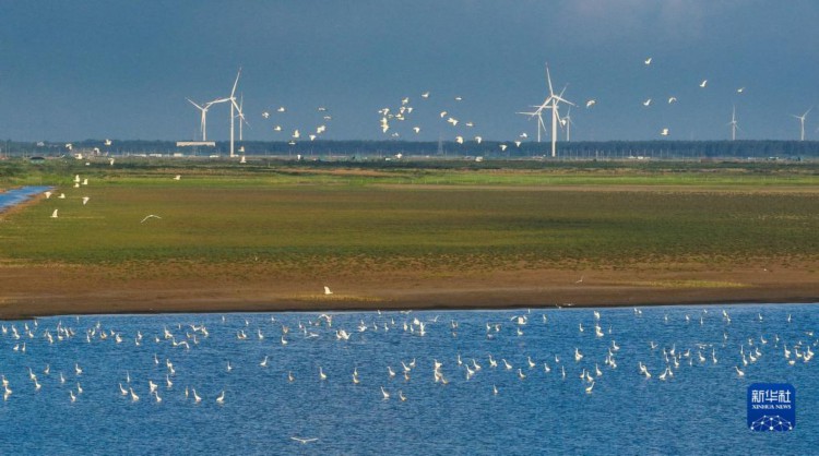 群鸟栖息在盐城东台条子泥湿地(2023年8月20日摄)。