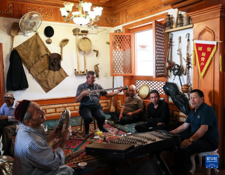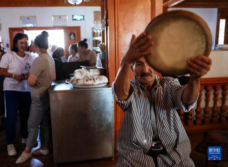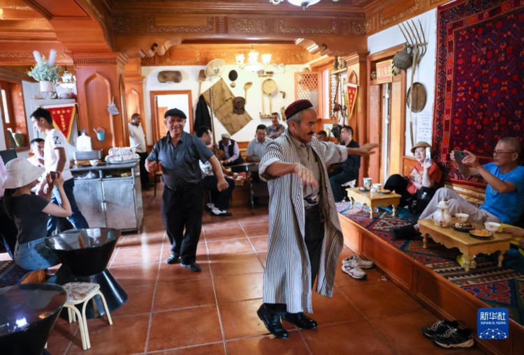 在新疆喀什古城百年老茶馆内,人们随音乐起舞(9月7日摄)。 穿过新疆喀什古城阡陌深巷,有一家历史悠久的百年老茶馆,这是当地人交流社交的重要场所,也是游客了解当地文化的理想去处。 时至仲秋,新疆喀什仍是旅游旺季,老茶馆里每天都迎来天南海北络绎不绝的茶客,人们在这里驻足歇脚,品味在古丝绸之路上流传千年的茶气茗香。 近年来,随着对口援疆工作不断推进,位于塔克拉玛干沙漠边缘的喀什,群众生产生活条件得到极大改善,旅游事业大力发展,当地各族群众获得感、幸福感不断提升。 新华社记者 兰红光 摄