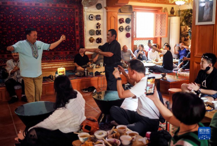 在新疆喀什古城百年老茶馆内,人们随音乐起舞(9月7日摄)。