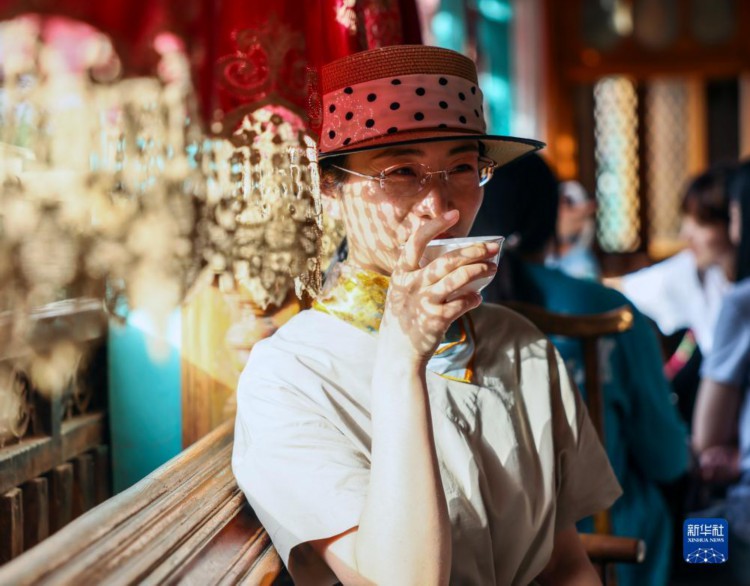 游客在新疆喀什古城百年老茶馆内品茶(9月7日摄)。