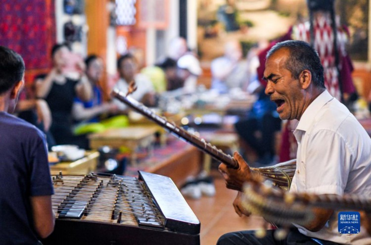 乐手在新疆喀什古城百年老茶馆内弹唱(9月15日摄)。