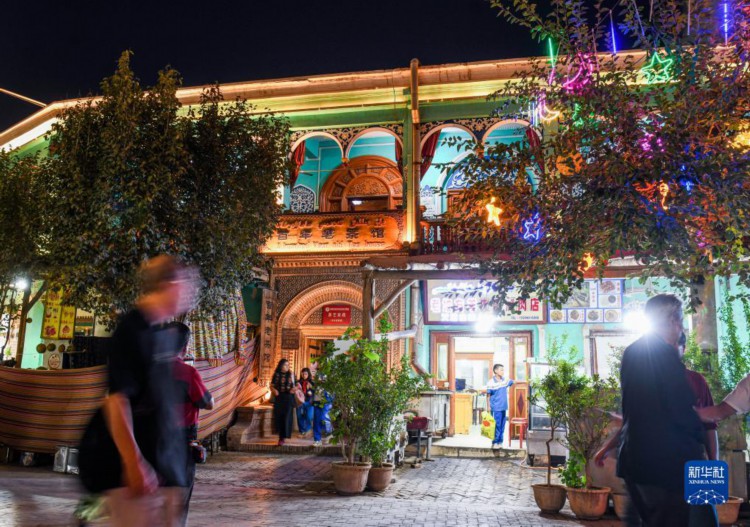 夜色中的新疆喀什古城百年老茶馆(9月15日摄)。
