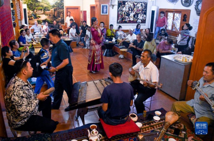 在新疆喀什古城百年老茶馆内,乐手在弹唱,人们随音乐起舞(9月15日摄)。