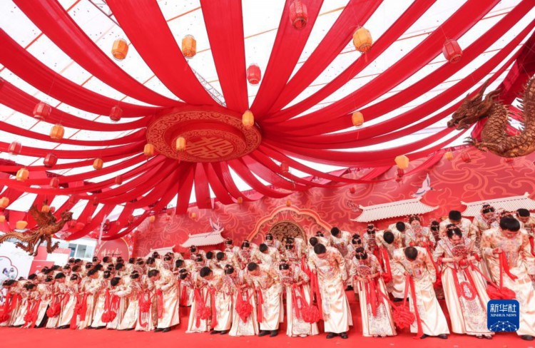 当日,在成达万(成都经达州至万州)高速铁路四川省蓬安县燕山寨隧道口的施工工地,来自中铁三局五公司各建设工地的38对新人,身着中国传统婚礼服饰参加集体婚礼。