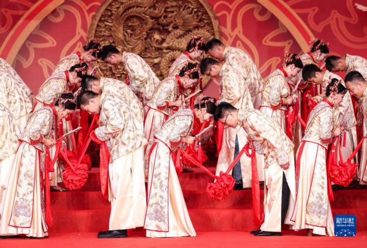 9月19日,在成达万高速铁路蓬安县燕山寨隧道口的施工现场,新人在集体婚礼上行拜礼。 当日,在成达万(成都经达州至万州)高速铁路四川省蓬安县燕山寨隧道口的施工工地,来自中铁三局五公司各建设工地的38对新人,身着中国传统婚礼服饰参加集体婚礼。 新华社记者 江宏景 摄