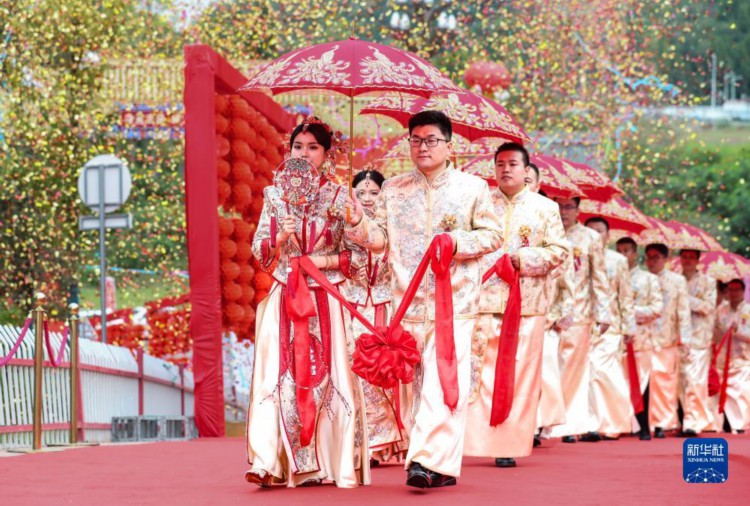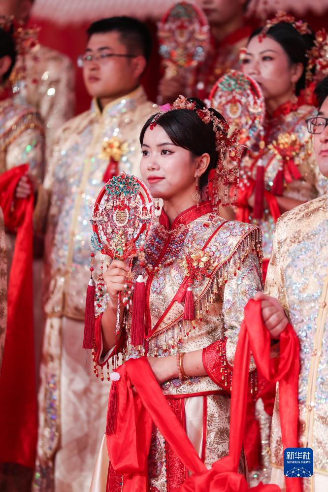 9月19日,在成达万高速铁路蓬安县燕山寨隧道口的施工现场,新人参加集体婚礼。 当日,在成达万(成都经达州至万州)高速铁路四川省蓬安县燕山寨隧道口的施工工地,来自中铁三局五公司各建设工地的38对新人,身着中国传统婚礼服饰参加集体婚礼。 新华社记者 江宏景 摄