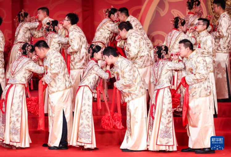9月19日,在成达万高速铁路蓬安县燕山寨隧道口的施工现场,新人在集体婚礼上行合卺礼。 当日,在成达万(成都经达州至万州)高速铁路四川省蓬安县燕山寨隧道口的施工工地,来自中铁三局五公司各建设工地的38对新人,身着中国传统婚礼服饰参加集体婚礼。 新华社记者 江宏景 摄