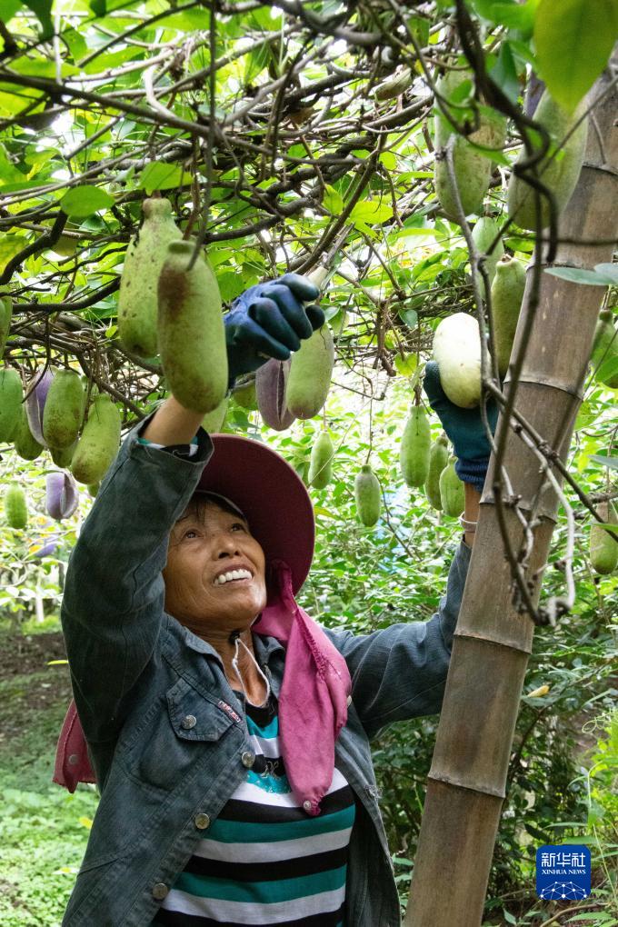 9月20日,湖南省永州市蓝山县所城镇高良头村八月瓜种植基地,当地果农在采摘八月瓜。 眼下,湖南省永州市蓝山县果农正忙着采摘八月瓜、猕猴桃等特色水果,以满足市场需求。近年来,蓝山县通过实施良种嫁接培育、增施有机肥等技术,因地制宜种植八月瓜、猕猴桃等特色水果共7万余亩,有效促进农业增效、农民增收。 新华社记者 柳王敏 摄