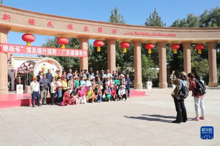 乘坐“穗疏号”广东援疆专列的广东游客,在“乐器村”合影留念(8月29日摄)。
