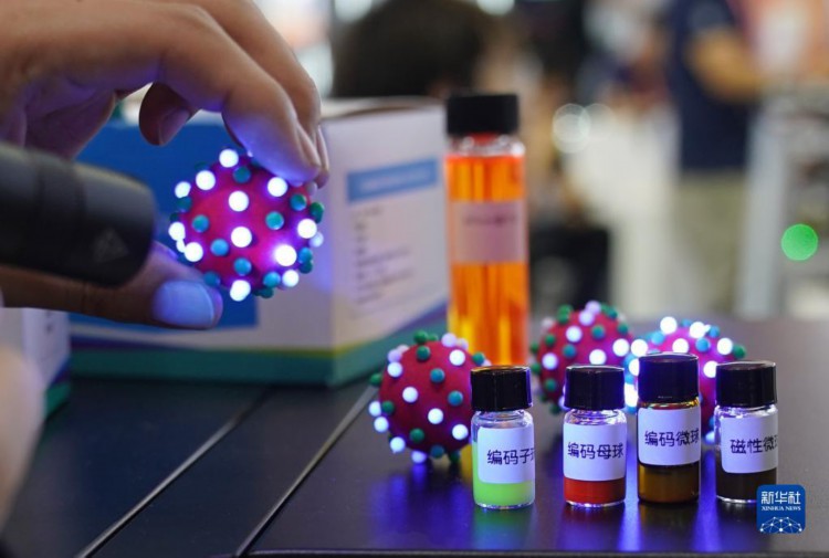 9月19日,上海交通大学的展台工作人员利用模型介绍新型编码液相芯片多指标检测技术。