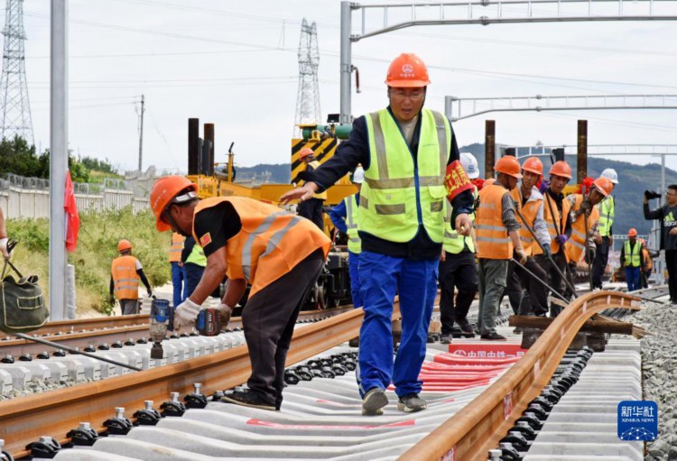 9月21日,中铁一局建设者在烟台芝罘站外铺设钢轨。
