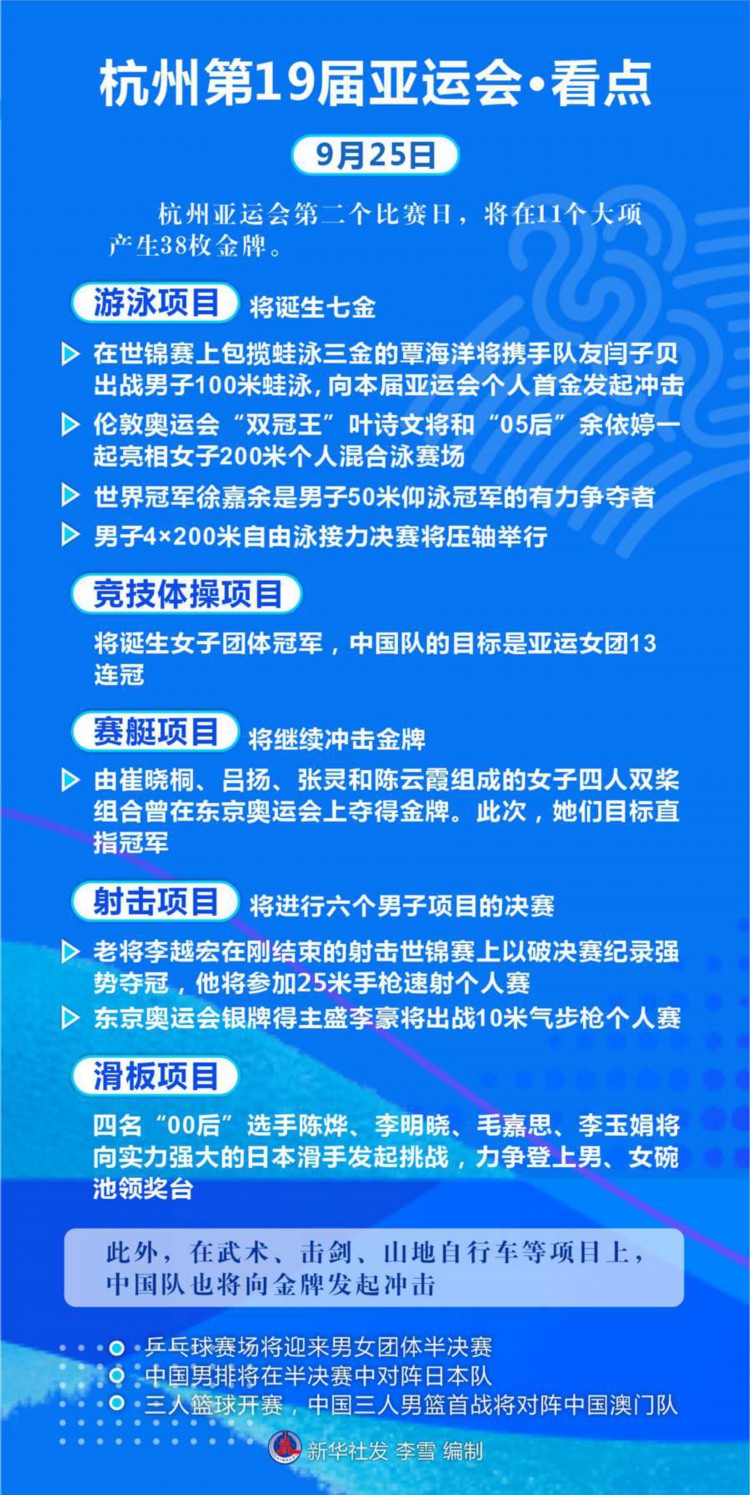 新华社杭州9月24日电(记者丁文娴、张泽伟、王恒志)25日是杭州亚运会开幕后第二个比赛日,将在11个大项产生38枚金牌。新“蛙王”覃海洋和连续12届亚运会体操女团冠军中国队都将全力以赴,捍卫冠军荣耀。