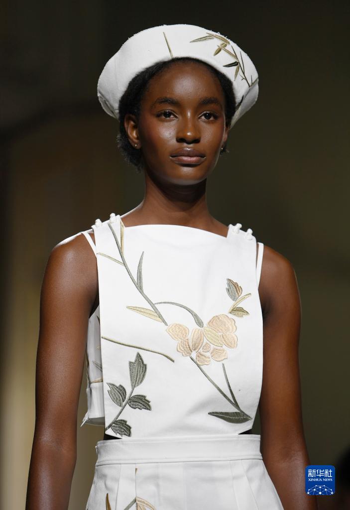 9月24日,模特在意大利米兰时装周上展示含有贵州苗绣元素的设计时装。 9月24日,“中国苗·艺术展”亮相2024春夏米兰时装周。千百年来,苗族群众用针当笔、用线为墨,将自然万物、民族历史绣在服饰上,苗绣也因此被称为“穿在身上的‘活化石’”。 新华社记者 金马梦妮 摄