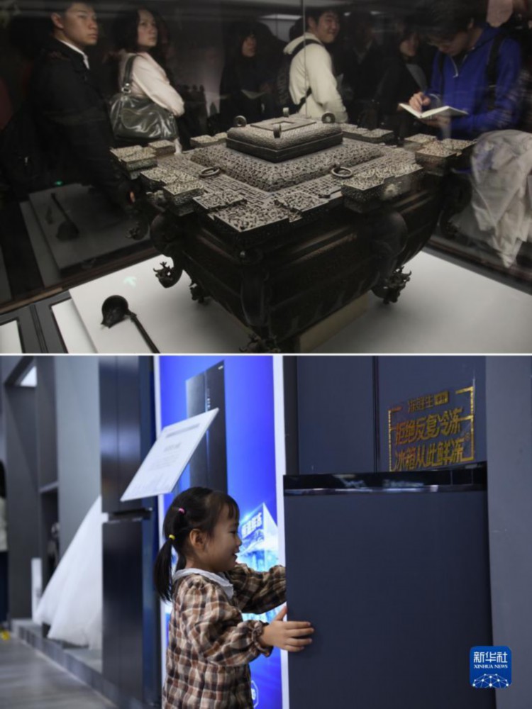 拼版照片:上图是上海世博会城市足迹馆中由国家博物馆收藏的战国曾侯乙铜鉴缶,它被誉为我国最早的冰箱(2010年4月18日摄);下图为2023世界制造业大会上展出的智能冰箱(9月23日摄)。