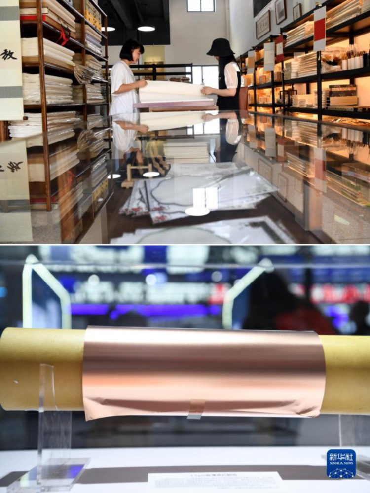 拼版照片:上图为2021年7月21日,在安徽省宣城市泾县丁家桥镇宣纸大市场一家店面,工作人员向顾客介绍宣纸产品;下图为2023世界制造业大会上展出的3.5微米极薄高抗铜箔(9月23日摄)。