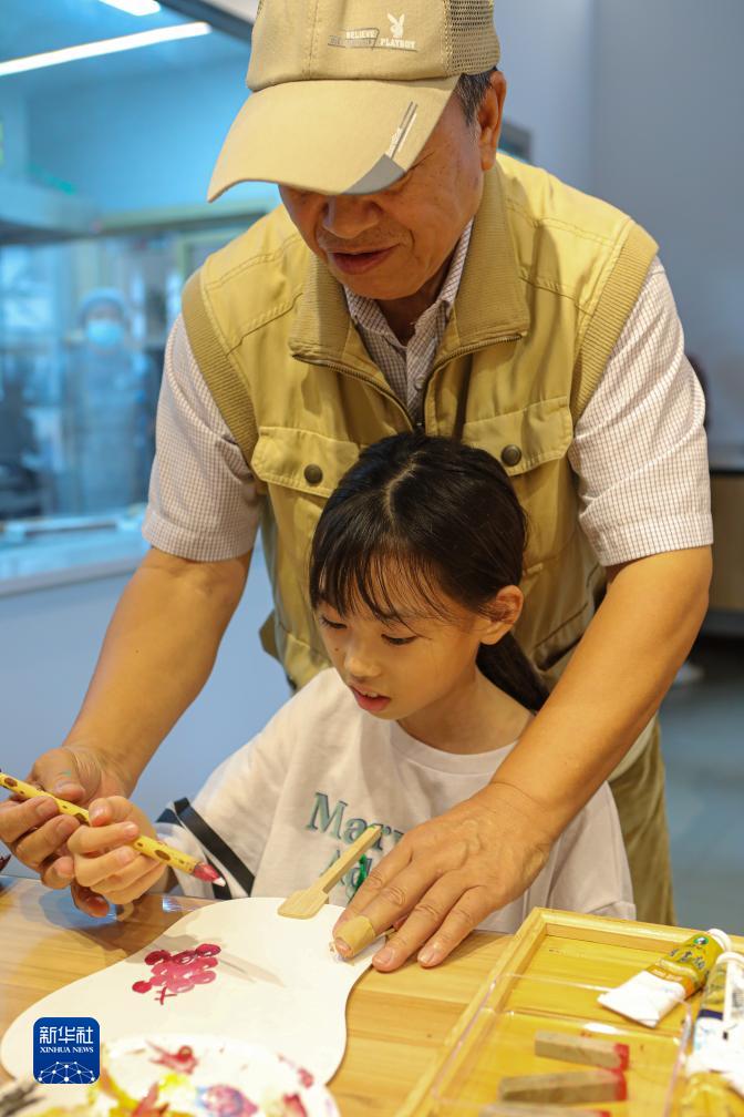 9月24日,在娄塘塌饼非遗传承馆,外国小朋友体验画扇面。 当日,以“老外看嘉定·相约在娄塘”为主题的中秋联谊系列活动在上海市嘉定区娄塘古镇举行。活动邀请外国友人体验捏面人、画扇面、画皮影和吹糖人等一系列传统民俗文化项目,并欣赏传统民乐演出。 新华社记者 辛梦晨 摄 |
