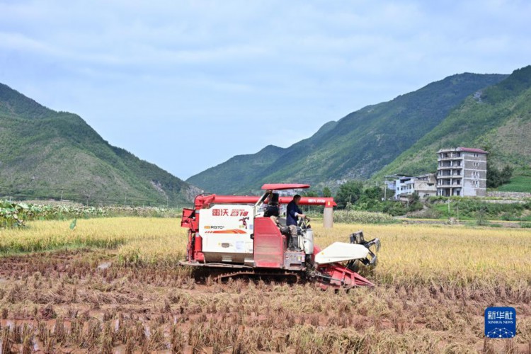 9月25日, 重庆市巫山县庙宇镇永安村村民在抢收受灾农田里的水稻。