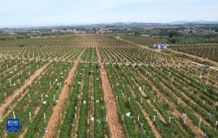9月25日,河北省卢龙县卢龙镇倪家庙村的农民在果园采摘酿酒葡萄(无人机照片)。 近日,河北省卢龙县卢龙镇的4000多亩酿酒葡萄进入成熟期,农民们开始进行采收,向酿酒企业销售,田间呈现出一派繁忙的景象。近年来,卢龙县卢龙镇依托当地葡萄酒酿造企业优势,引导农民因地制宜发展酿酒葡萄种植,促进农民增收,助力乡村振兴。 新华社记者杨世尧摄