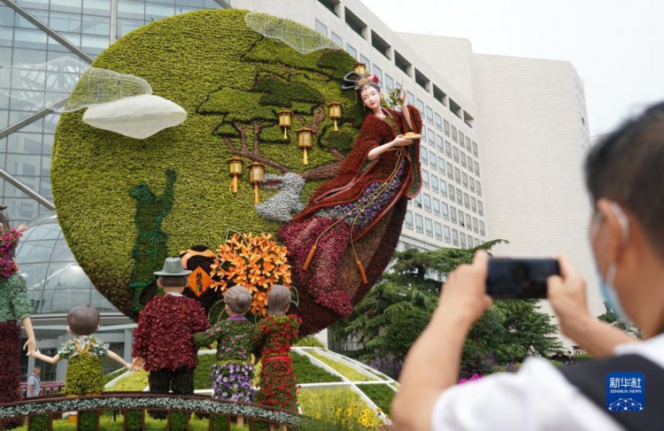 9月25日,市民在北京西单一处花坛前拍照。 中秋及国庆节假期日益临近,北京天安门广场的“祝福祖国”巨型花篮及长安街沿线立体花坛精彩亮相,吸引游人及市民观赏留念。 新华社记者 张晨霖 摄