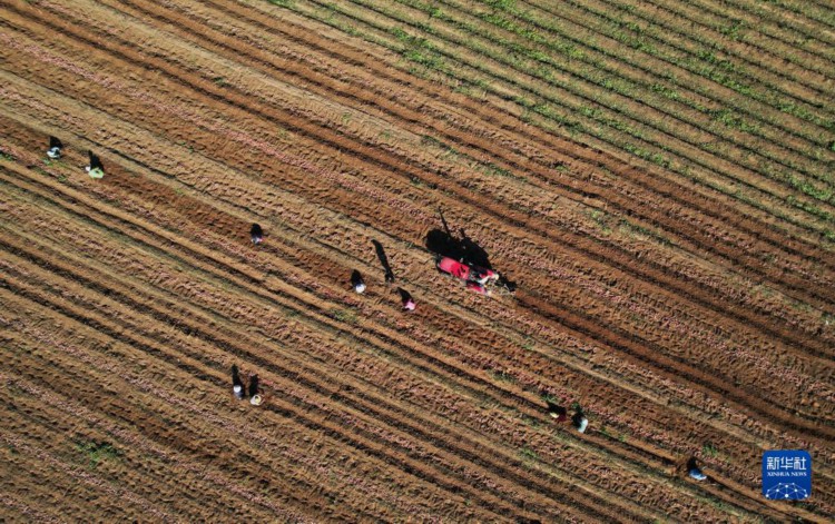 9月25日,河北省卢龙县卢龙镇一家红薯种植合作社的社员在收获红薯(无人机照片)。 金秋时节,河北省卢龙县农民抢抓农时收获红薯,今年全县红薯种植面积达12万亩。近年来,当地政府根据辖区沙质土壤透水透气性好的特点,引导农民采取“合作社+农户”的模式,规模化发展红薯种植,并成立多家红薯产品深加工企业,逐步探索出富有特色的“甜蜜”致富路。 新华社记者 杨世尧 摄