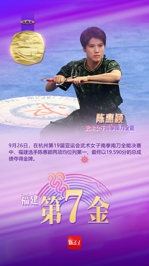 9月26日,在杭州第19届亚运会武术女子南拳南刀全能决赛中,来自福建福州连江的陈惠颖在南拳比赛中得到9.790分,在南刀比赛中得到9.800分,两项均位列第一,最终以19.590分的总成绩夺得金牌,这是福建选手在本届亚运会上夺得的第七枚金牌。