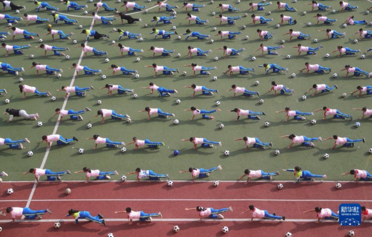 9月26日,河北省秦皇岛市海港区耀华小学的学生在大课间练习足球操。