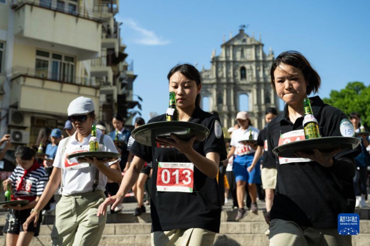 当日是“世界旅游日”,澳门旅游局在澳门大三巴牌坊举办传统托盘比赛,今年的托盘比赛以“澳门有礼”为主题,约150名澳门餐饮旅游业服务者手托装有啤酒的托盘参赛,起点为大三巴牌坊,终点为议事亭前地。