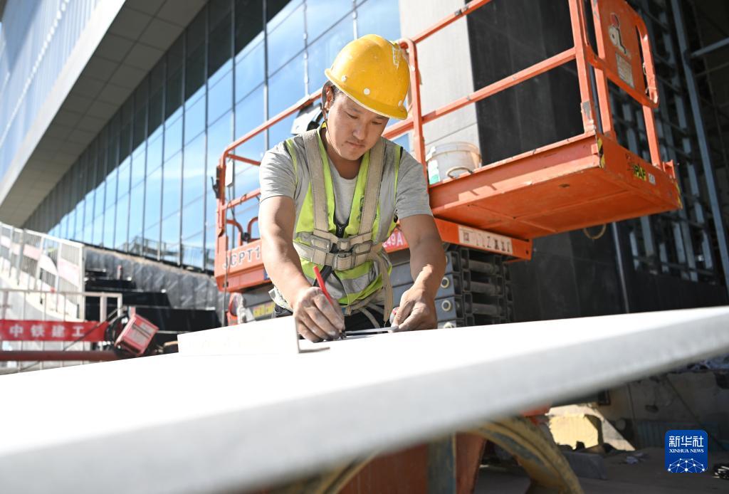 10月1日,中铁建工工人在雄安新区大学园图书馆项目裁切外立面石材。