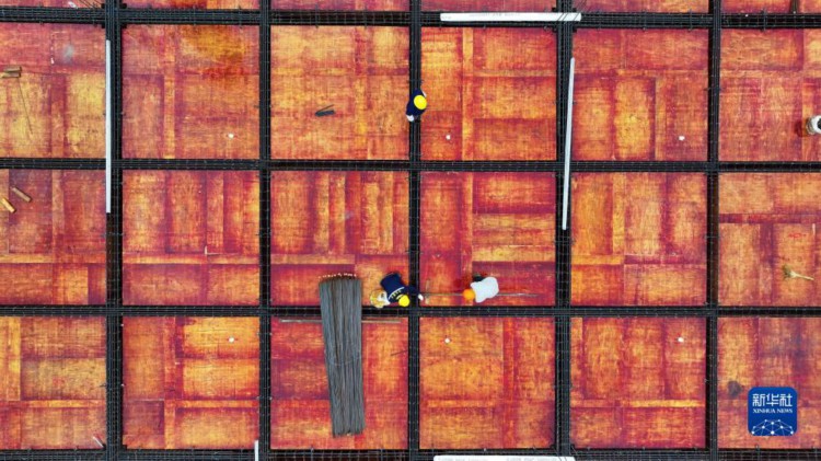 10月7日,工人在江苏洪泽经济开发区一项目工地忙碌。 中秋、国庆“双节”假期结束,各地企业开足马力,生产一线一派热火朝天的景象。 新华社发(陈凯 摄)
