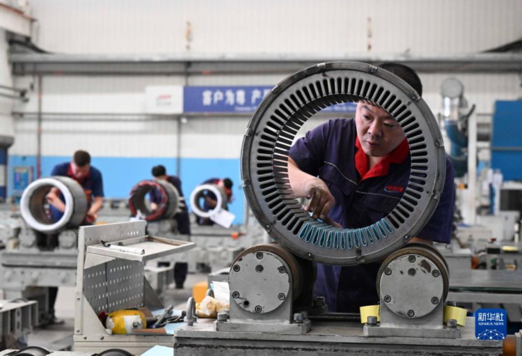 10月7日,工人在石家庄装备制造产业园河北电机公司电机车间进行嵌线作业。 中秋、国庆“双节”假期结束,各地企业开足马力,生产一线一派热火朝天的景象。 新华社发(陈其保 摄)
