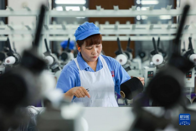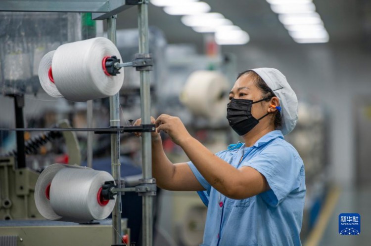 10月7日,工人在贵州省黔东南苗族侗族自治州三穗县一家运动服饰企业纺织车间工作。 中秋、国庆“双节”假期结束,各地企业开足马力,生产一线一派热火朝天的景象。 新华社发(龙兴伟 摄)