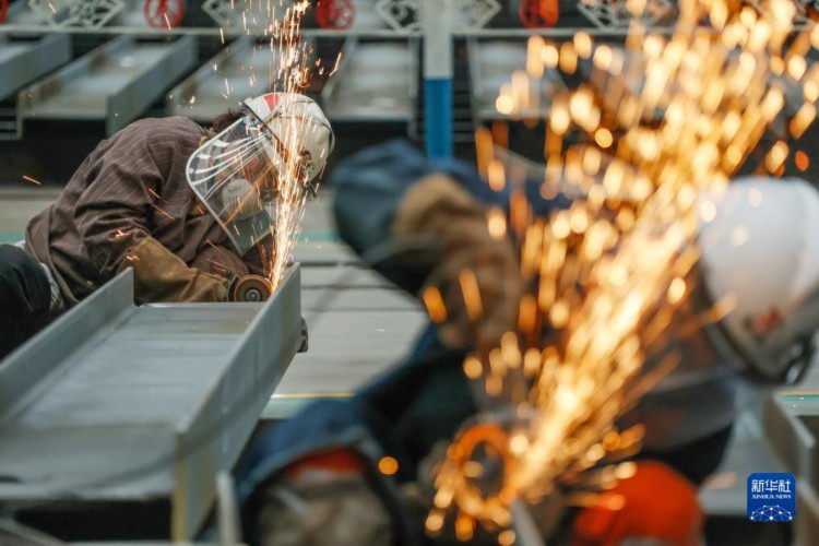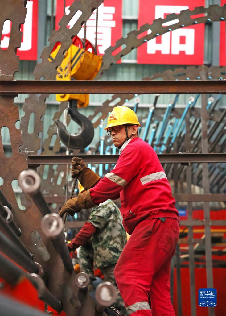 10月7日,工人在海油工程天津智能化制造基地结构预制车间内进行切割作业。 中秋、国庆“双节”假期结束,各地企业开足马力,生产一线一派热火朝天的景象。 新华社发(杜鹏辉摄)