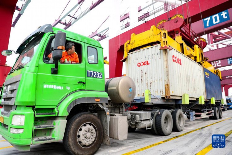 10月7日,集装箱货车在山东港口青岛港运载货物。 中秋、国庆“双节”假期结束,各地企业开足马力,生产一线一派热火朝天的景象。 新华社发(张进刚 摄)