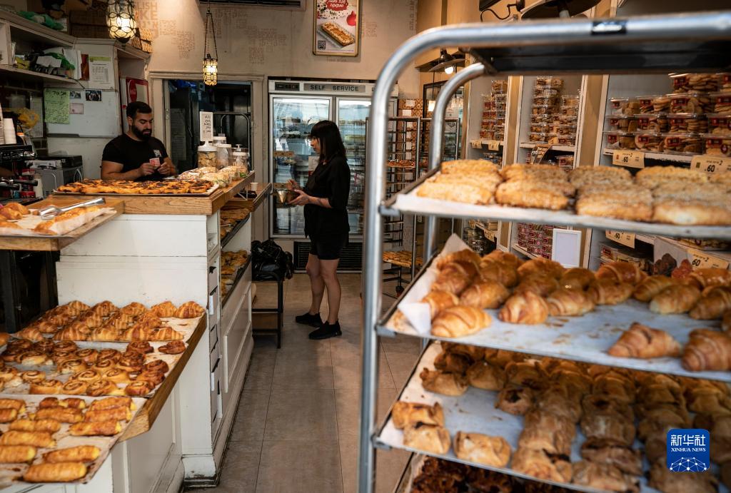 10月8日,一名女子在耶路撒冷街头店铺里买面包。