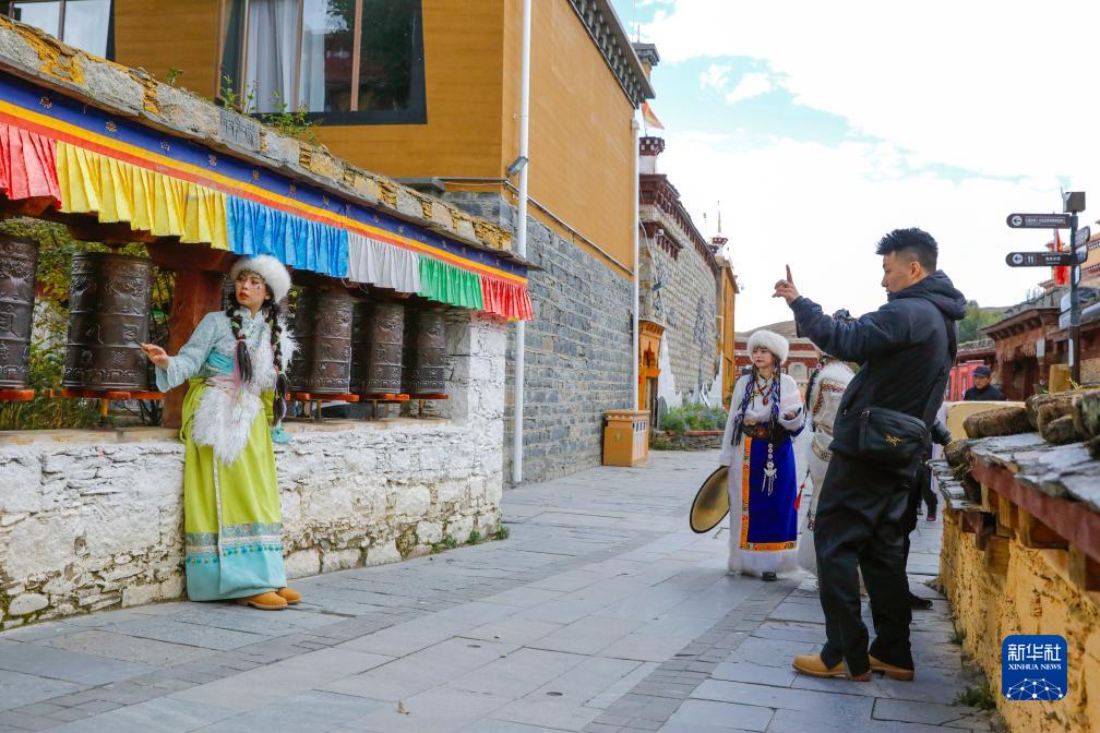 10月10日,游客在理塘县勒通古镇拍藏族风情写真。