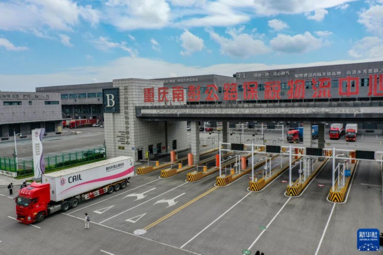 10月11日,满载笔记本电脑配件、发电机组件等产品的西部陆海新通道跨境公路班车从重庆南彭公路保税物流中心驶出,将途经广西凭祥,直达越南(无人机照片)。