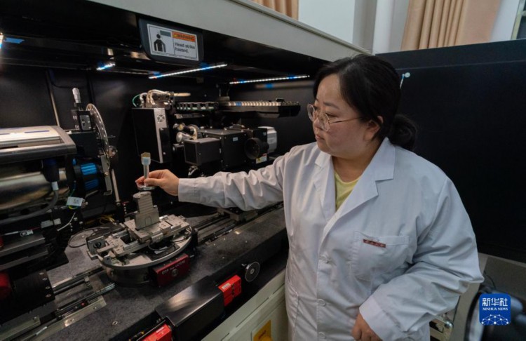 10月11日,云南大学古生物研究院“节肢动物演化研究”课题组成员麦慧娟将一块古生物化石放入CT扫描仪内。