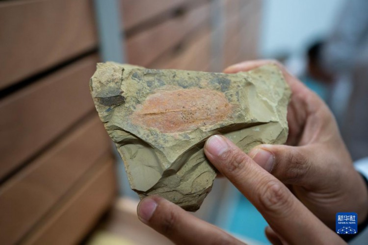 10月11日,云南大学古生物研究院研究员刘煜在化石存放库里展示一块化石。