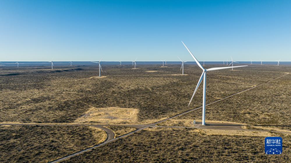 这是6月12日在阿根廷丘布特省马德林港拍摄的罗马布兰卡一期风电场(航拍照片)。