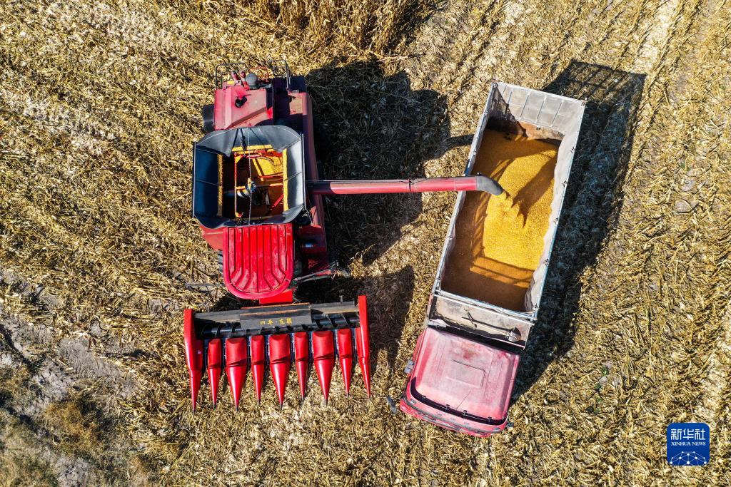 10月15日,在内蒙古通辽市科尔沁左翼中旗腰林毛都镇车家子嘎查,籽粒收割机将玉米装入运粮车,再运输至“粮食银行”(无人机照片)。