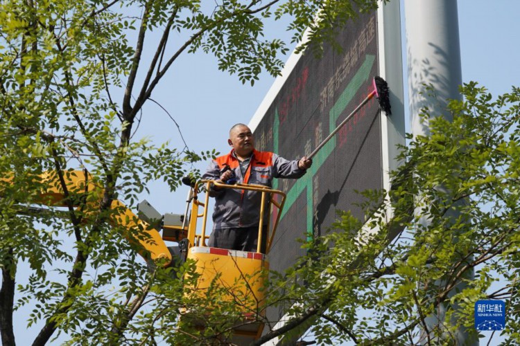 10月17日,保洁人员在清理交通信息牌。 “城市家具”作为城市的重要组成部分,小到垃圾箱,大到公共厕所、公交站台,与市民生活息息相关。日前,山东省济南市城管局通过“城市家具一体化综合保洁”新模式,采取分级分类、综合一体的作业方式,作业范围由平面向立面延伸,由局部向整体扩展,道路深度保洁率达90%以上,城市主次道路机扫率、洒水率均达到100%。 新华社记者 朱峥 摄