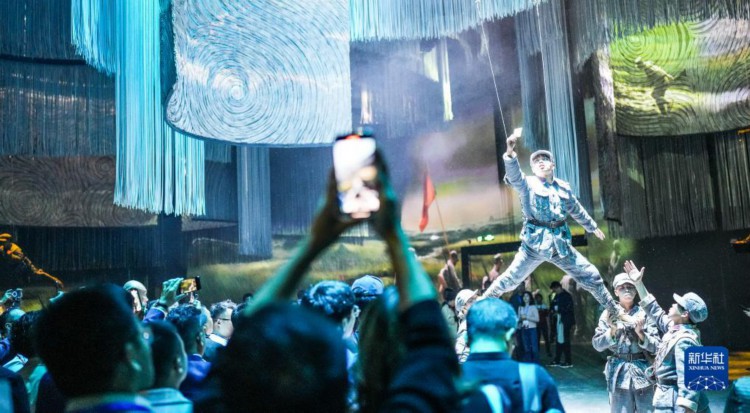 10月22日,观众在“红飘带”数字体验馆内观看体验长征故事。 10月22日,以长征为主题的数字体验馆——“红飘带”项目在贵州省贵阳市开始试运营,现场利用全息影像、三维声场等新技术再现伟大长征。“红飘带”项目是贵州推进长征国家文化公园建设的重要标志性工程,通过“艺术+科技”的形式,讲述长征故事,传承红色基因。 新华社记者 陶亮 摄