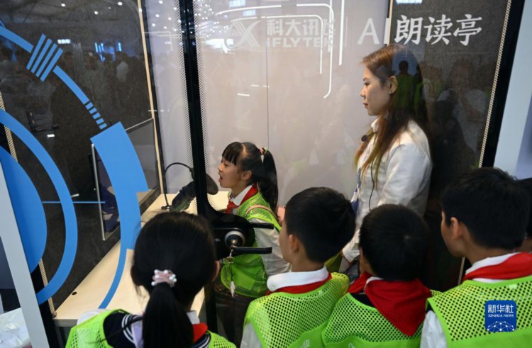 10月24日,小朋友们在第六届世界声博会上参观体验AI朗读。 当日,第六届世界声博会暨2023科大讯飞全球1024开发者节在安徽省合肥市开幕。本届声博会为期6天,现场设有科技馆、工业馆、行业馆、教育馆、生活馆、生态馆等多个主题展馆,展出人工智能领域最新科技成果及应用。 新华社记者 周牧 摄