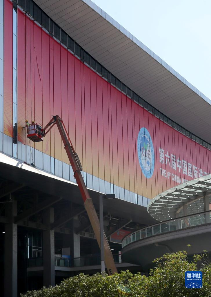 10月24日,施工人员在国家会展中心(上海)西入口外张贴进博会主题外立面装饰贴纸。