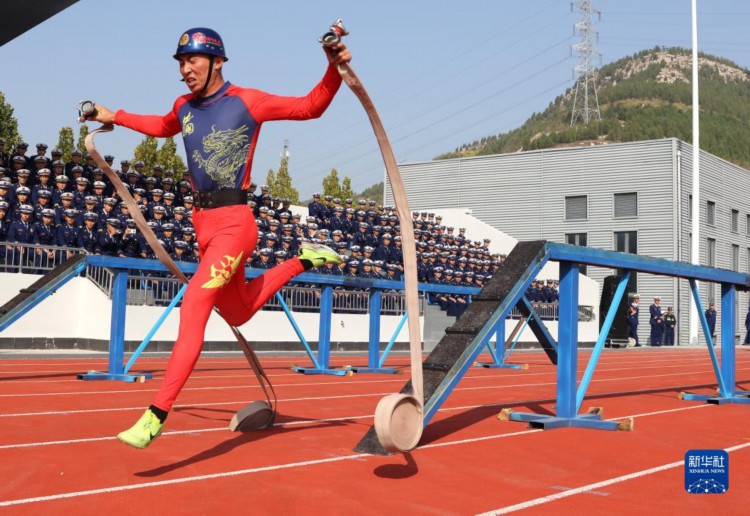 10月25日,消防员在闭幕式上进行消防百米障碍演示。