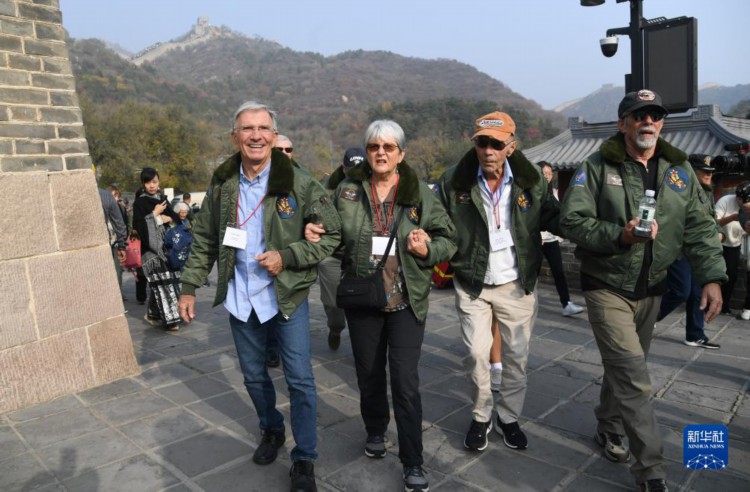 10月29日,飞虎队老兵莫耶(前右二)在北京八达岭长城参观。