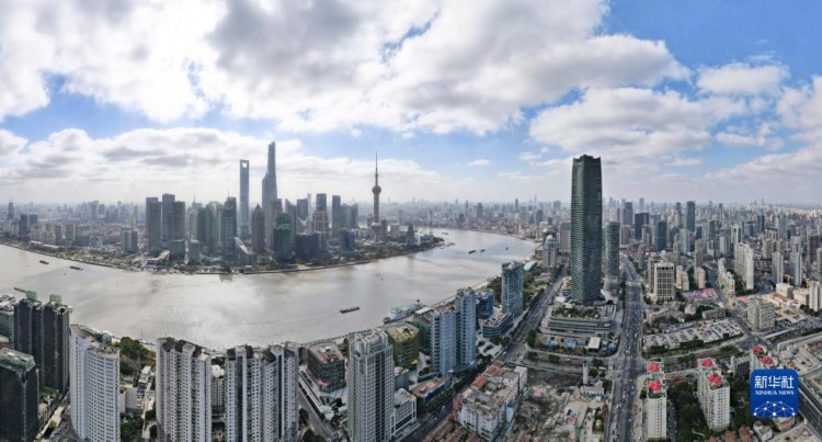 从上海虹口区北外滩空中俯瞰黄浦江两岸(1月10日摄,无人机全景照片)。