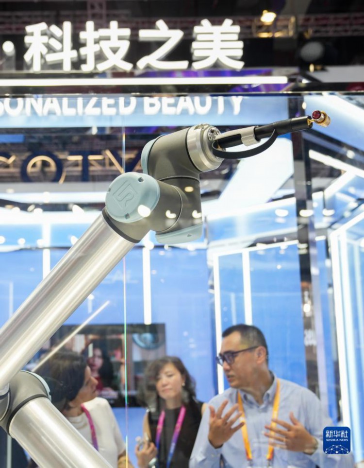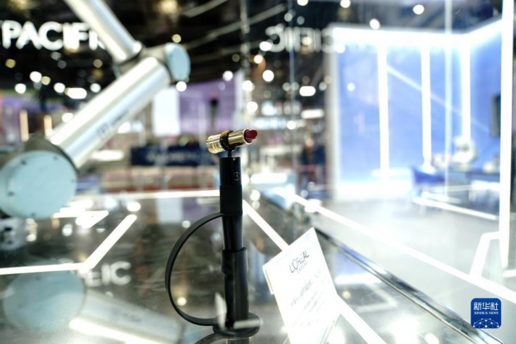 11月5日,在第六届进博会消费品展区,欧莱雅展出全球首款手持式超精准智能上妆仪,该产品专为手臂活动能力受限的消费者设计。 当日,第六届中国国际进口博览会在国家会展中心(上海)开幕,众多首发首展的新科技、新成果、新展品亮相本届进博会。 新华社记者 张建松 摄