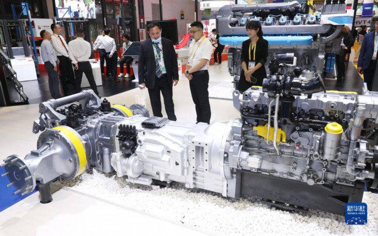 11月5日,参观者在第六届进博会林德公司展出的的大马力拖拉机CVT动力总成系统模型展品旁交流。 当日,第六届中国国际进口博览会在国家会展中心(上海)开幕,众多首发首展的新科技、新成果、新展品亮相本届进博会。 新华社记者 方喆 摄